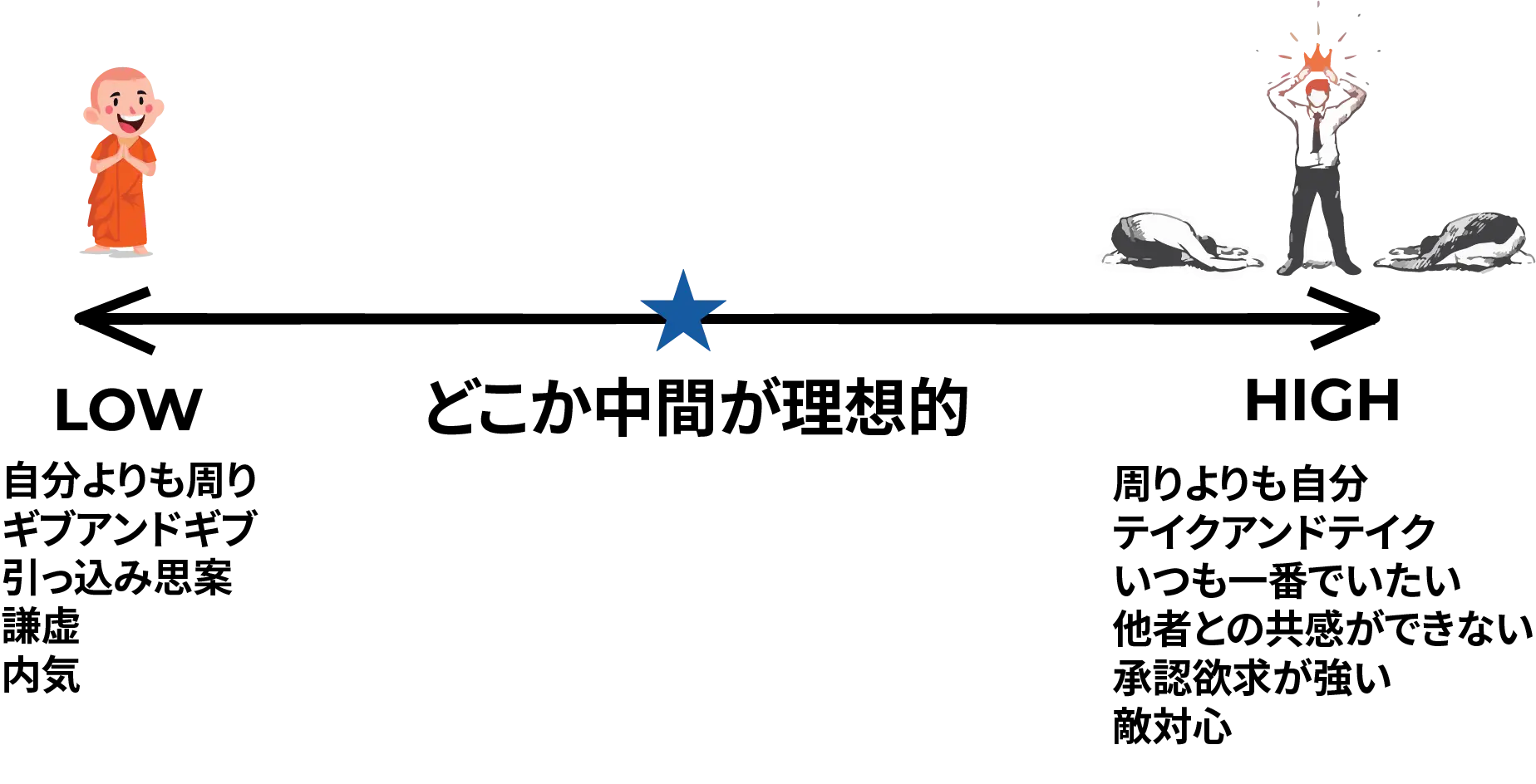 ナルシシストの度合いが低いのは良い様であっても、実は健康的ではありません。イエスマンであったり、押しに弱かったり。引っ込み思案で自分の価値を開示できなかったり。実際の自分の意思とは反対のことを周りのため、と思いするも、結局したくないことをされてる感がして辛い思いをしたり。周りに使われてしまうような存在になることも多くあります。